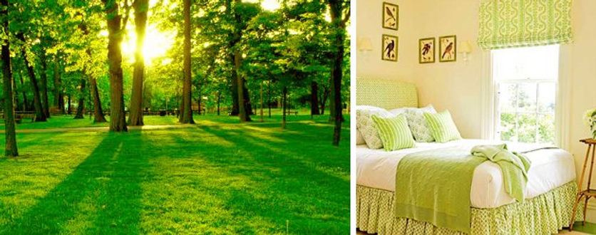 Зеленый цвет интерьера считается холодным и статическим, успокаивающе действует на психику. Он оптимален для человеческого зрения, понижает кровяное давление, полезен для концентрации внимания, повышает работоспособность. Однако, большие поверхности, окрашенные в зеленый (особенно темных оттенков) – выглядят крайне уныло. Зато сочетание светлых оттенков зеленого с белым цветом – ассоциируется с весной, молодой травой и листьями.